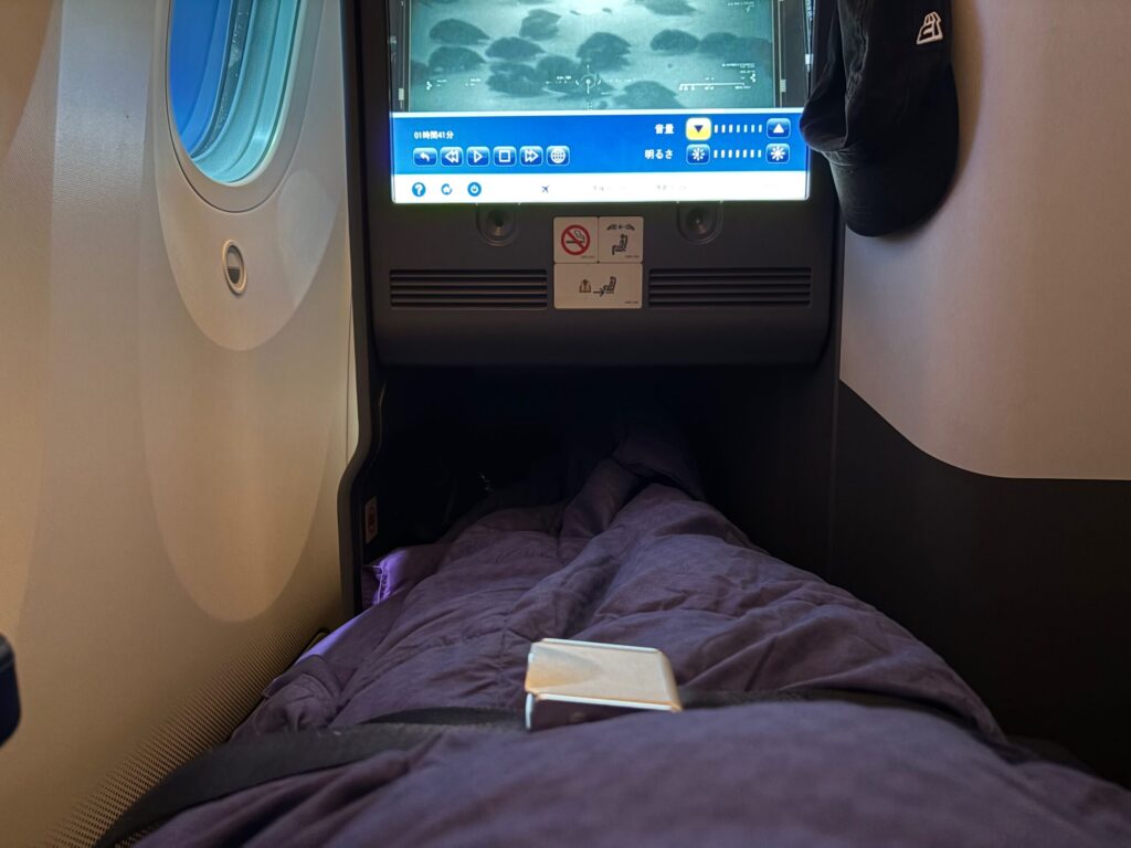 一番良かったのが、座席がフルフラットになることで、14.5時間もあると必ず寝るタイミングがやってきます。
