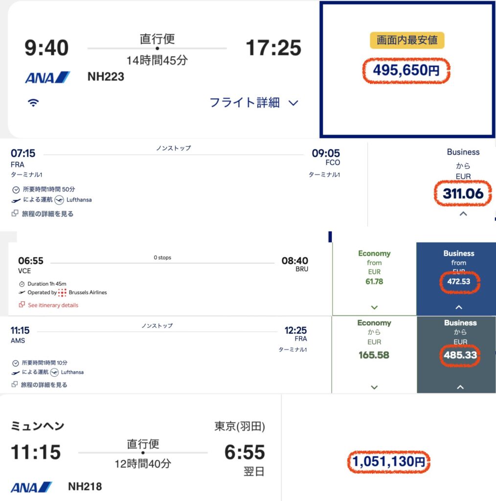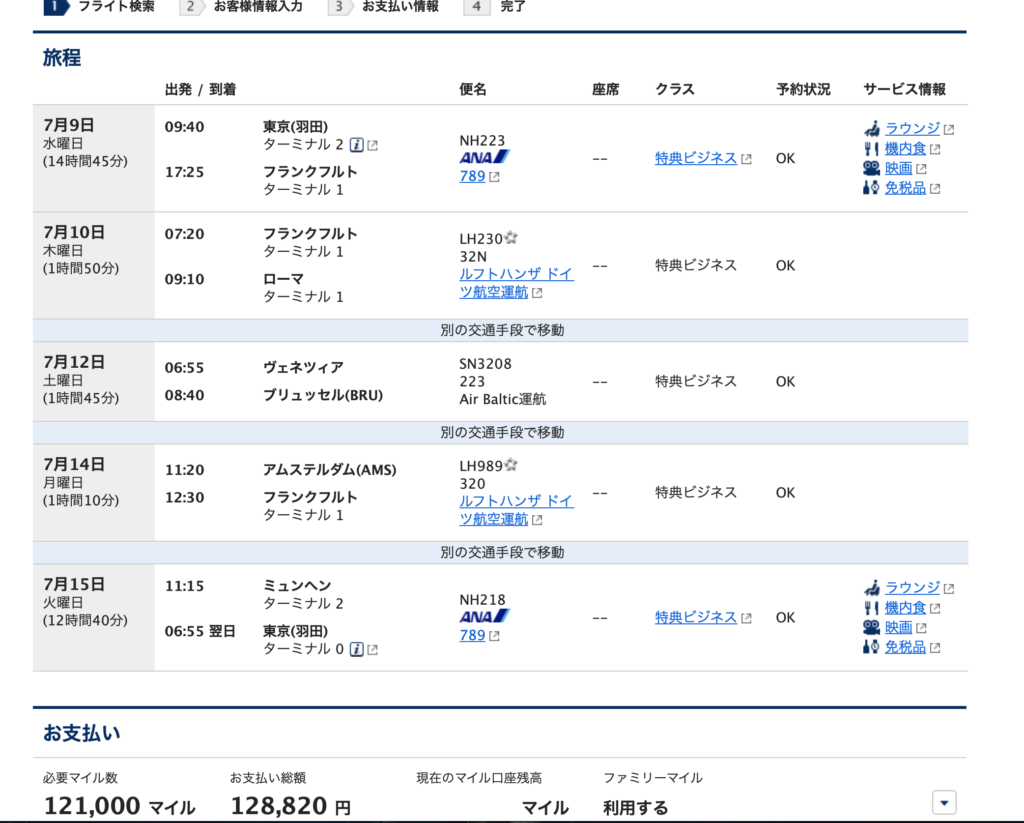 12.1万マイルと約12.9万円で5つのフライトで全てビジネスクラスです!