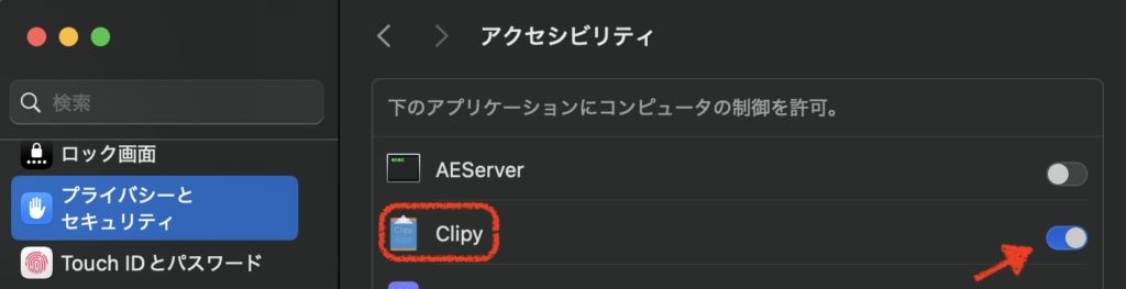 そして、Macの設定から「プライバシーとセキュリティ」で「Clipy」をオンにします。