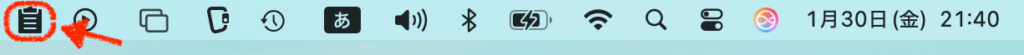Clipyを起動すると、メニューバー(画面右上の時計などの横)に「リストようなアイコン」が表示されます。