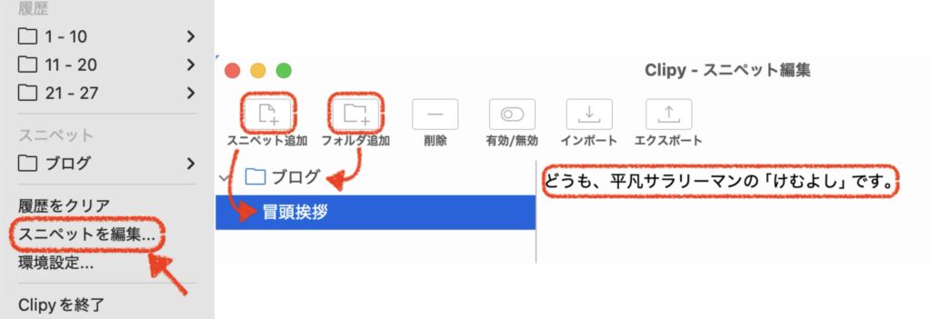 Command+Shift+V」→「スニペットを編集」で編集画面が開きます。 - 編集画面で「フォルダ追加」→「スニペット追加」で登録可能!