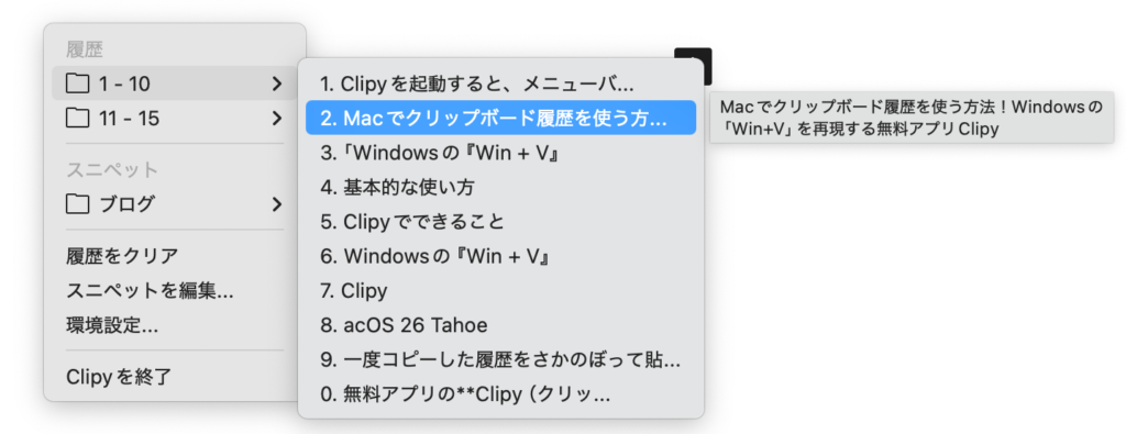 一度コピーした履歴をさかのぼって貼り付けられるあの機能、実はMacの標準機能にはありませんでした。(※MacOS 26 Tahoeで最近追加されたそうです!)