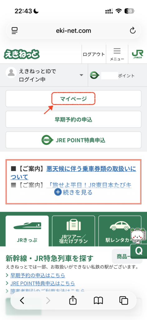 えきねっとにログインすると、すでに当選した新幹線のチケットを保有しています。