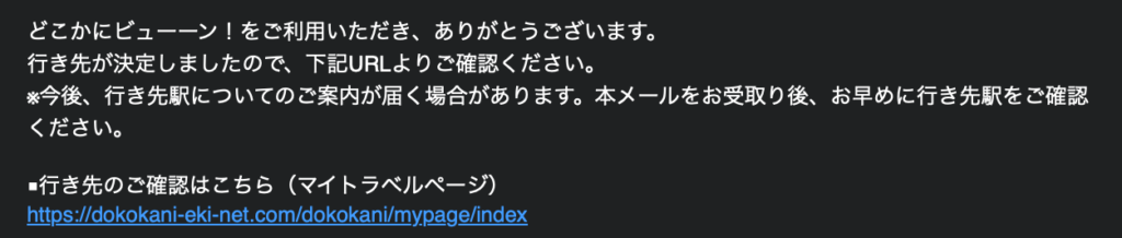 実は「どこかにビューーン!」の行先通知はメール上ではわからなくなっていて、URLにアクセスすることでわかるよになっていて、演出もあり結構ドキドキします!