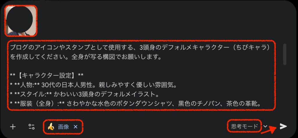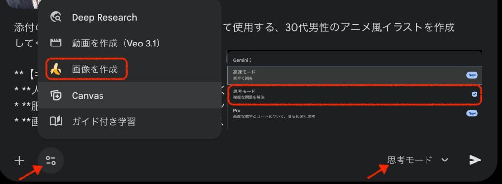 2.「画像を作成」、「思考モード」を選ぶ