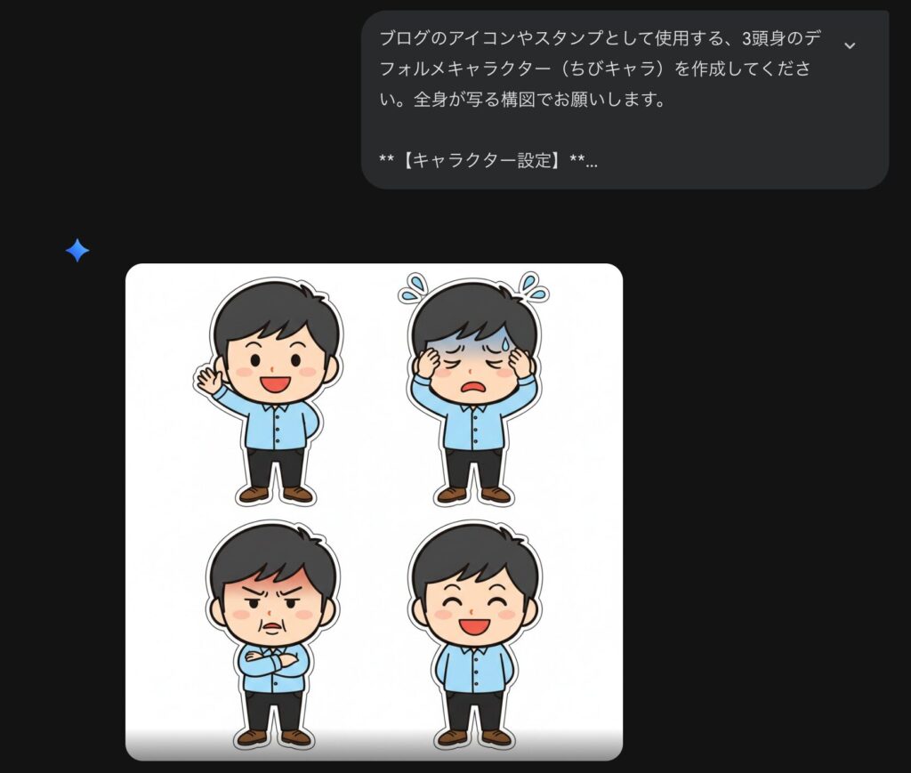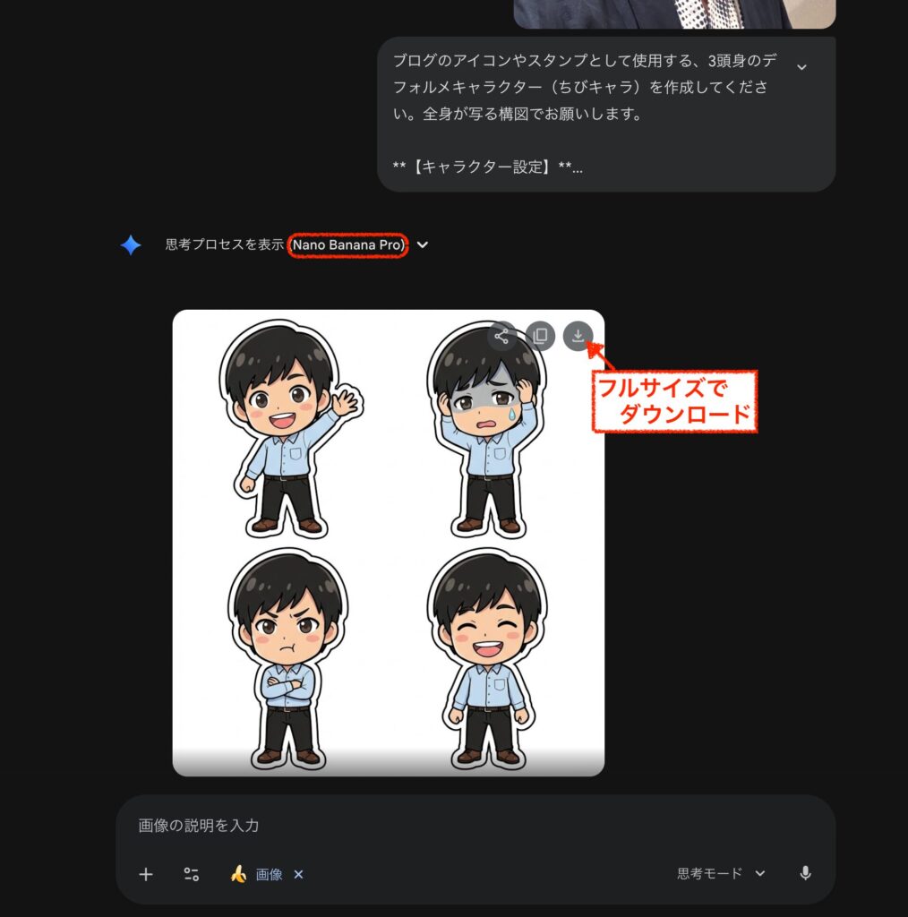 ただし、次回以降の記事で説明しますが、このキャラクターのデザインを維持しつつ、のポーズや表情を作成する場合は、「思考モード」の「Nano Banana Pro」をお勧めします。