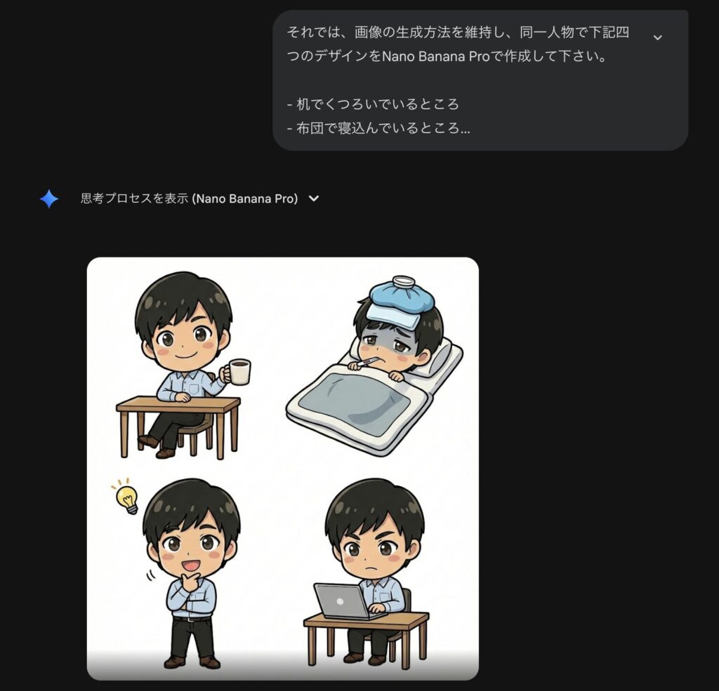 それでは、画像の生成方法を維持し、同一人物で下記四つのデザインをNano Banana Proで作成して下さい。