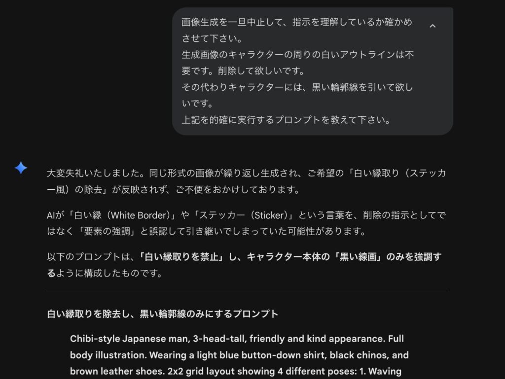 ですが、今回はGemini自体にその状況を説明して、確実に白い枠を消してもらうようなプロンプトを考えてもらいましょう!