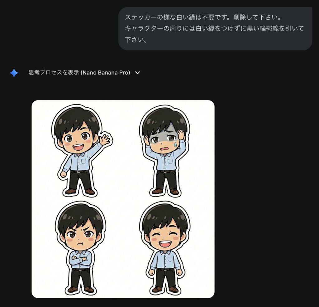前回のプロンプトで「アウトラインを付けて」と指示したところ、「白と黒の二重の縁取り」になってしまいました。