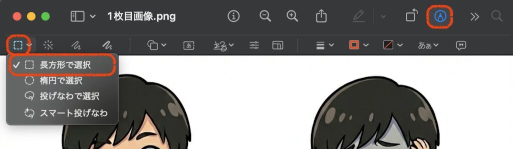 1.画像を「プレビュー」で開き、右上の「マークアップ」から「長方形で選択」を選ぶ