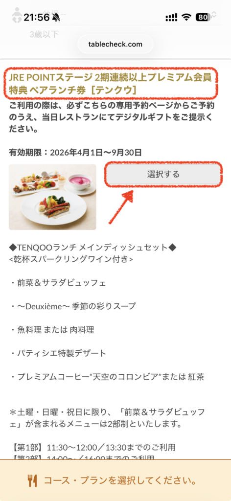 ここで注意が必要なのが、JRE POINTのペアランチ券のプランは席数が限られています。