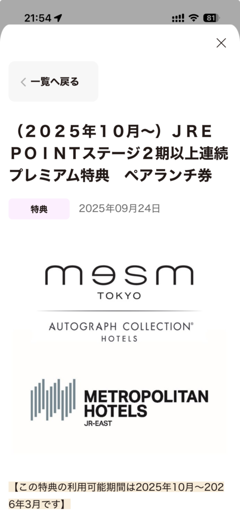 JRE POINT プレミアムステージ特典「ペアランチ券」の概要