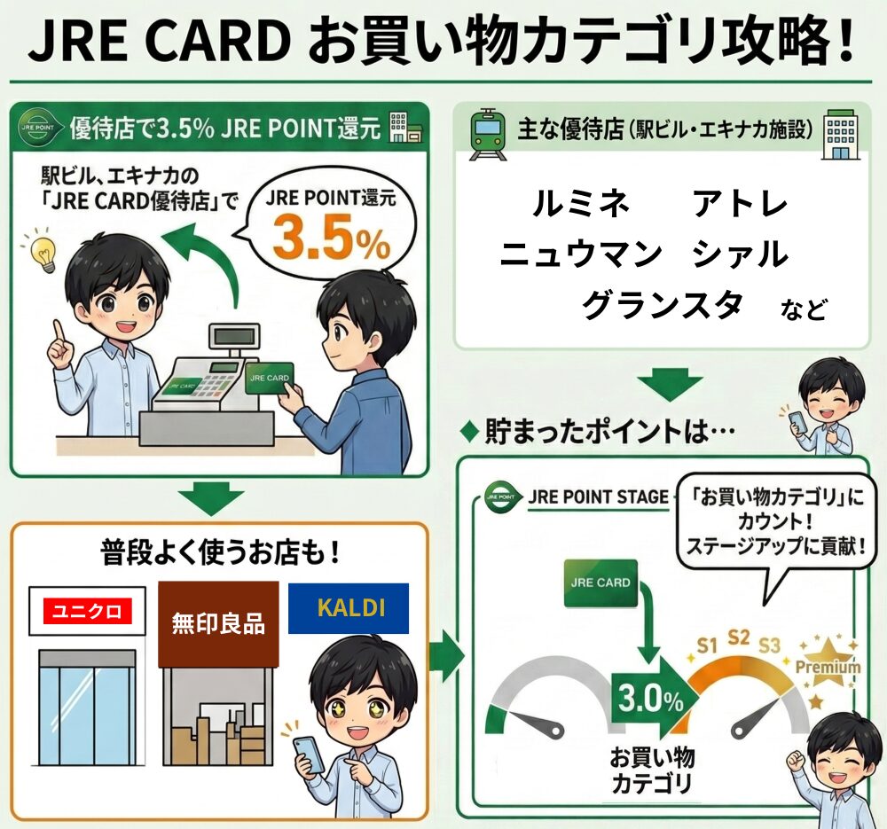 - JRE CARD優待店:「お買い物カテゴリ」のクリアと日常の買い物によるポイント獲得
