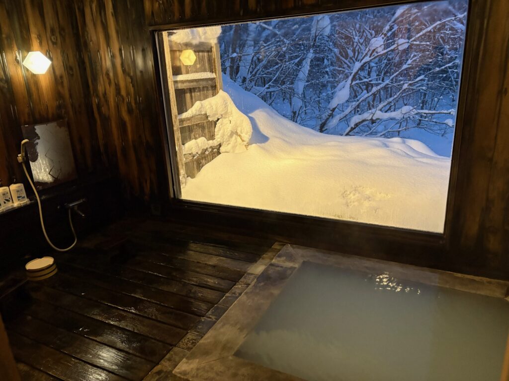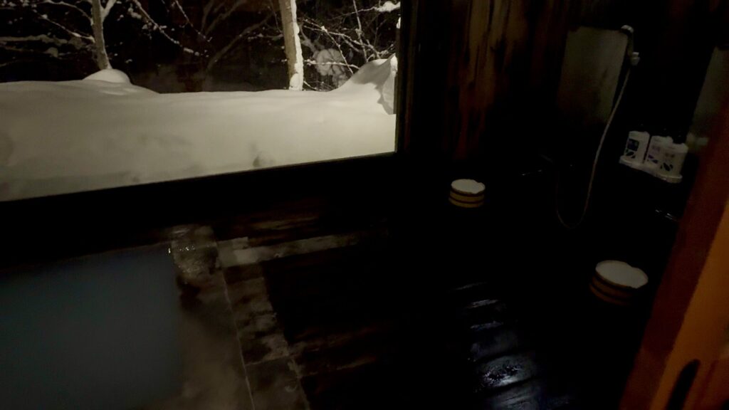 広めの空間に洗い場二つ、乳白色の湯船が一つ、そして内風呂ですが、大きな窓からサイコーの雪景色が広がっています。