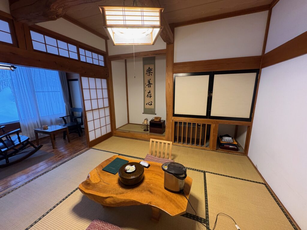 いい雰囲気の和室です。窓の外に広がる雪景色が何よりの贅沢。
