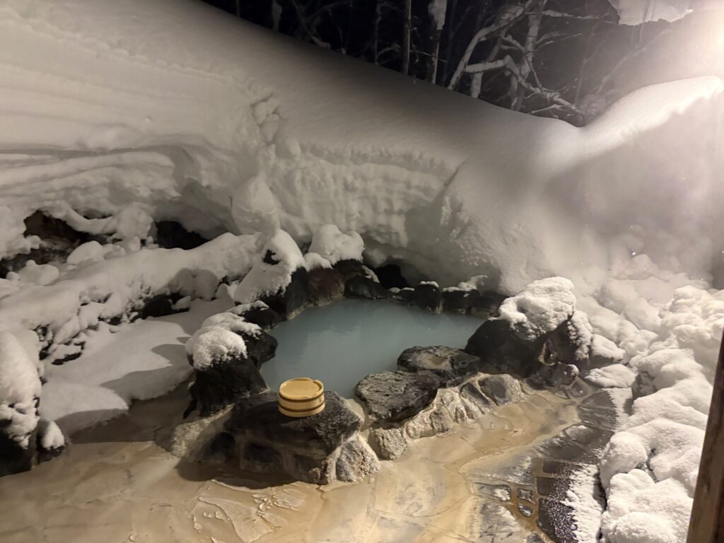 真っ白な湯気に包まれ、見上げれば冬の夜空。時折、木々から雪がハラハラと落ちてくる音だけが響きます。